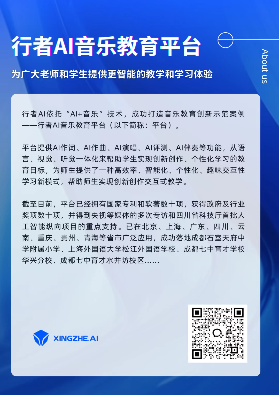 本月底,陳老師將代表泰州出征江蘇省數(shù)字化教學優(yōu)質(zhì)課大賽,行者AI團隊也將全力護航,為陳老師提供平臺功能的專屬優(yōu)化支持與教學細節(jié)的技術(shù)保障,助力她在省級賽場充分展現(xiàn)泰州數(shù)字化教學的創(chuàng)新成果,讓更多人看到AI賦能藝術(shù)教育的無限可能。在此,我們由衷預(yù)祝陳寧珺老師旗開得勝、再創(chuàng)佳績,在省級大賽的舞臺上綻放屬于教育與技術(shù)融合的耀眼光芒!(掃描文后二維碼可免費領(lǐng)取“AI音樂教育平臺”試用賬號)